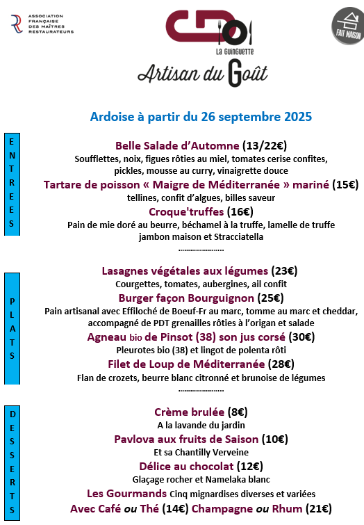 La carte est déclinée avec un choix varié d’entrées, de plats, de desserts